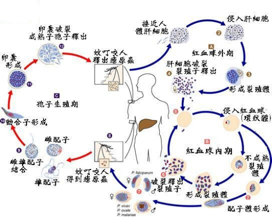 疟疾俗称“打摆子”,“发疟子”,主要是通过按蚊叮咬或输入带疟原虫的血液而感染所引起的传染病。疟疾现症患者或无症状感染者是传染源。能感染人体的疟原虫有五种:恶性疟原虫、间日疟原虫、三日疟原虫、卵形疟原虫和诺氏疟原虫。疟原虫在人体可寄生于红细胞内或肝细胞内。