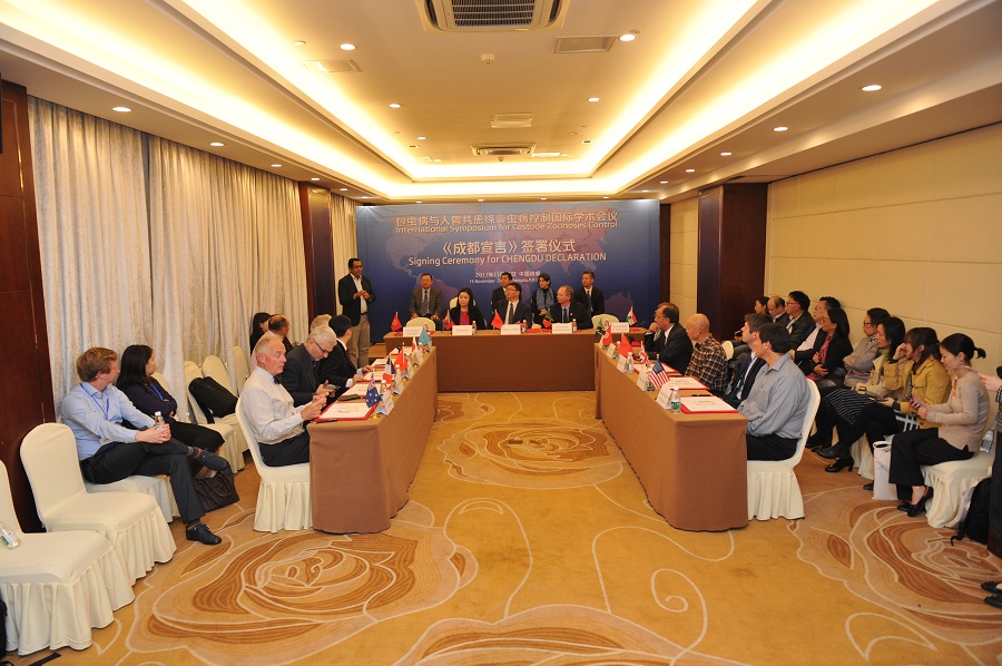 3. 建立了 “一带一路”包虫病和绦囊虫病控制和消除网络。通过与“一带一路”沿线及相关国家专家们的合作讨论,由13个国家的专家共同签署了《成都宣言》,建立了一个由学者、科学家、企业家和决策者共同参与的国际网络合作平台,必将加快诊断、治疗和疫苗等领域的研究与转化,加强多部门协作,提升监测应对机制和能力建设,最终助力实现2030年包虫病和带绦虫/囊尾蚴病控制的目标。