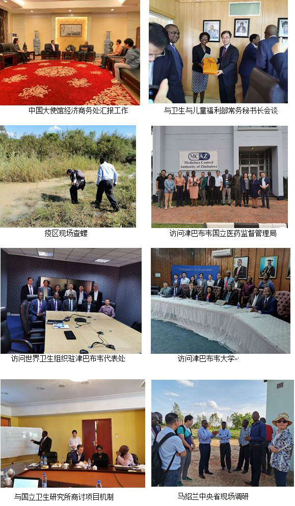 根据前期走访情况,调研组与津巴布韦国立卫生研究所研讨控制血吸虫病合作项目谅解备忘录、项目方案。双方计划在津巴布韦血吸虫病流行区域开展试点,通过中国援助津巴布韦项目,传播中国血防经验,提高津巴布韦血吸虫病防治能力,逐步控制与消除津巴布韦血吸虫病。
