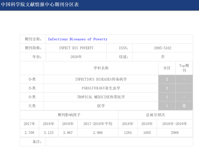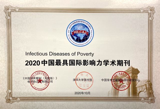 2020年,Infectious Diseases of Poverty(IDP)在全球新冠肺炎大流行中乘风破浪,砥砺前行,取得了一些成绩。在《2020年中国科学院文献情报中心期刊分区表》中位列医学大类一区期刊(TOP 5%),在《中国学术期刊(光盘版)》电子杂志社有限公司与清华大学图书馆合作联合研制并发布的《中国学术期刊国际引证年报(自然科学与工程技术)》中,IDP入选“2020中国最具国际影响力学术期刊”(国际影响力指数为156.924,Top 5%)。