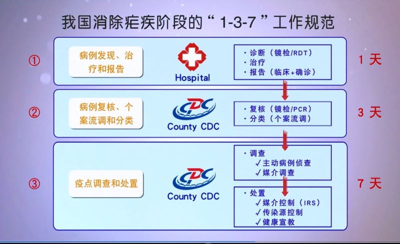 (五)消除疟疾阶段(2010-2020年):2010年启动《中国消除疟疾行动计划(2010-2020年)》,将全国流行县分4类实施强化控制或消除策略。2011年建立“国家寄生虫病防治信息管理系统”。2012年总结提出消除疟疾的“线索追踪,清点拔源”策略和“1-3-7”工作规范。2016年24个流行省全部建立省级疟疾诊断参比实验室。2017年全国首次实现无本土原发感染疟疾病例。2020年实现消除疟疾目标,并于2021年6月30日通过了世界卫生组织的消除疟疾认证。