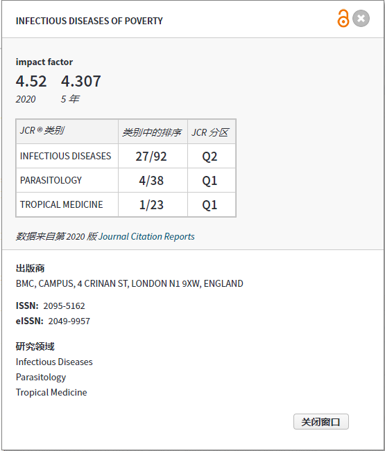 Infectious Diseases of Poverty《贫困所致传染病(英文)》致力于发表贫困所致传染病、新发/再现传染病等相关跨学科高水平论文,为卫生政策制定提供科学依据,为创新理论和技术研究提供交流平台。该刊入选中国科技期刊卓越行动计划,在《2020年中国科学院文献情报中心期刊分区表》中位列全球医学大类一区期刊(TOP 5%),被评为2020年中国最具有国际影响力学术期刊。
