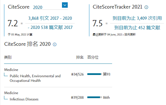 1.2 据爱思唯尔发布的2020 CiteScore,IDP 2020年的CiteScore是7.2,在Scopus公共卫生、环境和职业卫生领域中位于第93百分位(34/566),在感染性疾病领域位于第86百分位(39/288)。