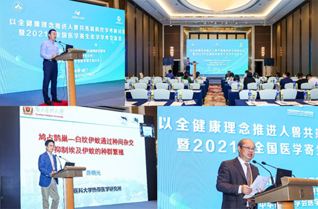中国疾控中心寄生虫病所周晓农所长致开幕辞,介绍了中华预防医学会医学寄生虫分会在中心服务大局、现场服务防治、与时俱进改革创新等方面的下一步工作规划任务,提出要将医学寄生虫分会建设成为具体广泛影响力的国内一流寄生虫专业学术团体,并在学术交流和健康科普传播方面应发挥更大作用。他同时宣读了2021年全国优秀寄生虫健康教育作品的评选结果。本次会议邀请了多名业内权威专家围绕“以全健康理念推进人兽共患病防控”作专题报告,内容涵盖病原生物学、分子生物学、感染与免疫等基础科学、流行病学、监测防治、应用科学等多个领域。中国气象局公共气象服务中心柳艳香研究员作了气象变化与健康主题报告,介绍了近年我国的天气气候事件及气候变化对健康的主要影响和影响途径。中国科学院王四宝教授作了利用肠道共生菌阻断疟疾传播的主题报告,提出了一种遏制疟疾传播的绿色新武器。南京医科大学苏川教授介绍了寄生虫感染的免疫基础与突破需求,分析了免疫反应在寄生虫病免疫治疗、免疫调控、预防疫苗等方面的作用。中山大学吕志跃教授介绍了重要入侵病原快速溯源技术研究进展,并结合实践案例介绍了具体应用情况。中国农业科学院兰州兽医研究所刘光远研究员围绕药物杀灭、生物控制和免疫疫苗等防控技术介绍了蜱的防控研究进展。复旦大学程训佳教授作了寄生虫病感染与过敏性疾病主题报告,展望了后寄生虫时代的过敏性疾病防治。南方医科大学陈晓光教授介绍了白纹伊蚊通过种间杂交抑制埃及伊蚊的生殖繁衍研究报告,分析了白纹伊蚊与埃及伊蚊间的杂交特性及其对生殖繁衍的影响。新疆医科大学第一附属医院张文宝教授作了包虫病防治与研究进展的专题报告,介绍了不同国家和地区的包虫病防控模式和成效。