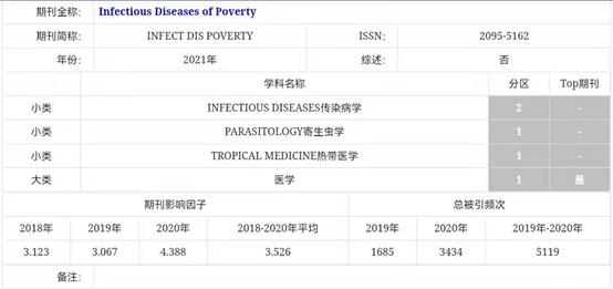 2021年,在主管、主办单位和专家学者的大力支持下,Infectious Diseases of Poverty的学术质量和影响力进一步提升。在《2021年中国科学院文献情报中心期刊分区表》的医学大类、寄生虫学和热带医学学科中,IDP位于1区,其中在医学学科中为Top期刊。在《中国学术期刊(光盘版)》电子杂志社有限公司与清华大学图书馆合作联合研制并发布的《中国学术期刊国际引证年报(自然科学与工程技术)》中,IDP连续三年入选“中国最具国际影响力学术期刊”(Top 5%)。