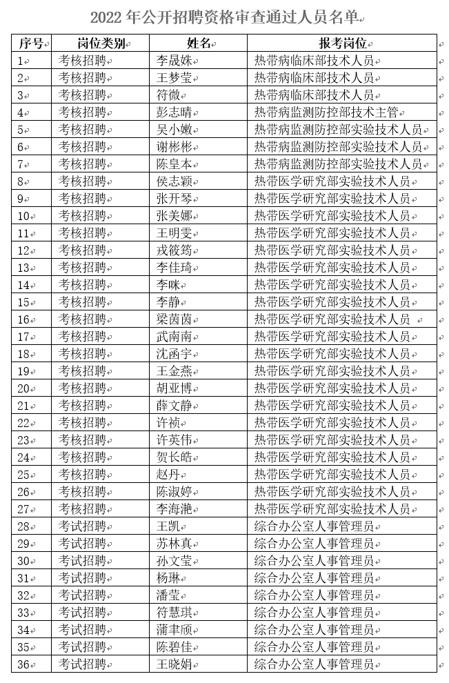 根据海南热带病研究中心2022年公开招聘工作人员公告,我中心对全部43名报考人员进行了资格审查,其中27名考生符合考核招聘报考条件,9名考生符合考试招聘报考条件。 综合办公室综合管理、编辑岗位因未达到预设定的招考比例,取消该岗位招聘。现将通过资格审查且可进入考试和考核程序的人员名单进行公示(见附件1)。