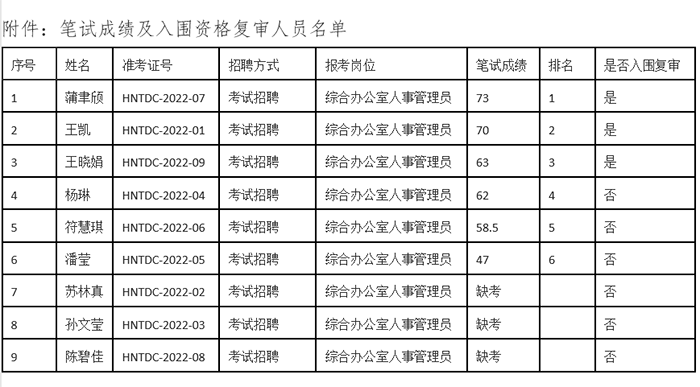 根据《海南热带病研究中心2022年公开招聘工作人员公告》,我中心已于2022年6月7日完成考试招聘笔试工作,现将笔试成绩、入围资格复审人员名单予以公告。