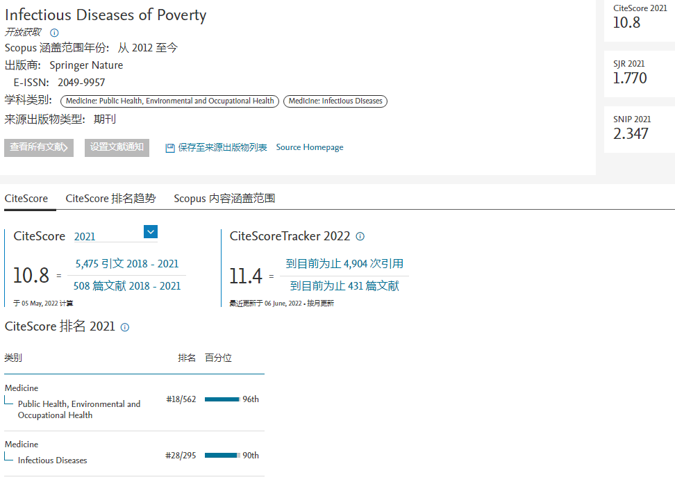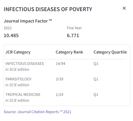 十年磨一剑,一朝露锋芒。近日,科睿唯安发布了《最新期刊引证报告》。在Infectious Diseases of Poverty(IDoP)创刊十周年之际,期刊的影响因子上升至10.485,CiteScore增长至10.8,在相应的学科领域均名列前茅。