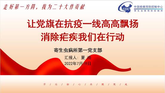 首先,支部副书记夏尚同志作了“让党旗在抗疫一线高高飘扬——消除疟疾我们在行动”的微党课,从支部所辖疟疾室、媒传热带病室和信息中心三个科室的业务互补融合角度出发,回顾历史,立足国内,援助海外,讲述了支部党员作为寄生虫病、热带病防控的第一方阵,在中国取得消除疟疾这一伟大历史成就中所做的贡献。接着,正在山西阳泉的驻点工作的支委周正斌同志给大家介绍了他在当地开展黑热病防治的工作情况和体会。