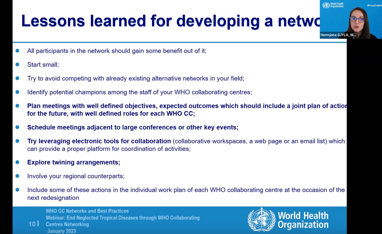 本次会议特邀世界卫生组织总部和西太区的卫生官员就消除被忽视热带病的现状和全球行动、被忽视热带病相关的世卫组织合作中心的作用和挑战等内容做系列报告。Hermjona Gjyla女士简要介绍了世界卫生合作组织的定位、功能、分布和工作方式,并在报告中明确了在世界卫生组织背景下,合作中心网络的定义和其在政策制定、促进就解决全球、区域和地区问题方面的思想交流和技术创新方面可发挥的作用。并分享了成功是合作网络需要具备的特质,如世界卫生组织的领导力、共同商定的战略计划、强有力的沟通协作体系、长期稳定的合作伙伴关系以及充足的资金支持。