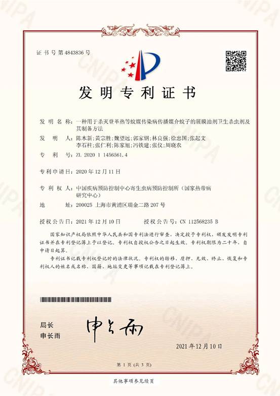 会议期间,陈木新研究员详细介绍了“一种用于杀灭登革热等蚊媒传染病传播媒介蚊子的展膜油剂卫生杀虫剂及其制备方法”发明专利的技术特点和研发及应用情况。据介绍,该产品是由寄生虫病所、广东农密生物科技有限公司、深圳市中大合顺生物科技有限公司、深圳市疾病预防控制中心、深圳市龙岗区疾病预防控制中心等五家单位联合研发,具有经济、高效、低毒、环保、易操作等优势。