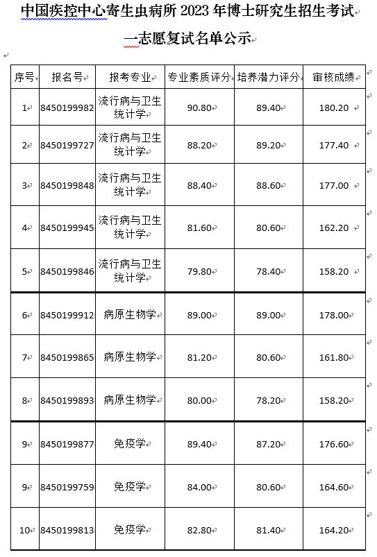 中国疾控中心寄生虫病所2023年博士研究生招生考试一志愿复试名单公示