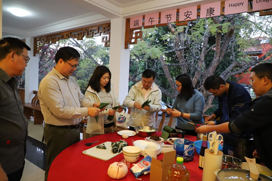 端午节活动上,专家们特意邀请了项目合作伙伴津巴布韦国立卫生研究所所长Midzi教授与他的家人,一同感受中国文化。长粽、三角粽,四角粽...非洲朋友们看到专家们包出各式各样的粽子,早已经跃跃欲试了,但试了几次都没有成功,一旁的周所长看到后耐心教起来:“上部的粽叶向下折,要盖住糯米,然后用手将叶子的两侧捏下去,之后粽叶尖端向一侧折叠……”周所长一边教,非洲朋友一边包,不一会,各式各样的粽子就装满了蒸屉,楼道里传来大家的阵阵笑声。