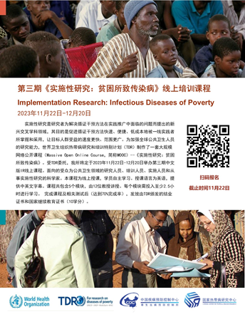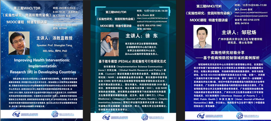 2023年11月22日-12月20日,第三期中文版WHO/TDR《实施性研究:贫困所致传染病》MOOC培训班在上海举办。本次课程除WHO/TDR开发的线上五个模块课程以外,特别邀请了昆山杜克大学汤胜蓝教授、南方医科大学徐东教授,以及广州中医药大学邹冠炀研究员开展专题讲座,就实施性研究的概念、相关模型和案例进行介绍和分析。