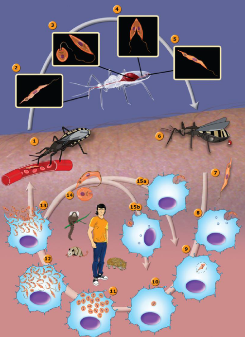 传播媒介为半翅目的锥蝽(triatomine)(俗名臭虫),多夜间吸血。当锥蝽叮咬哺乳动物宿主并摄入哺乳动物宿主血液中的锥鞭毛体后数小时,锥鞭毛体在肠内转变为无鞭毛体,而后转变为球鞭毛体进入中肠,发育为上鞭毛体,并在锥蝽中肠内以二分裂法大量繁殖,最后在锥蝽后肠转化为循环后期锥鞭毛体。当染虫锥蝽再次吸血时,循环后期锥鞭毛体在叮咬伤口附近的粪便中释放,通过伤口或完整的粘膜进入宿主。锥鞭毛体进入宿主血液后,感染巨噬细胞,并在细胞内分化为无鞭毛体。生活史示意图如下图所示。