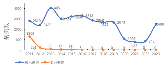 图1 2011-2023年间我国疟疾输入病例与本地病例情况对比