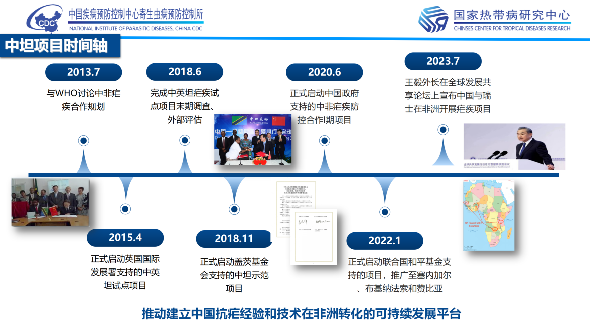 2023年7月,王毅主任在全球共享发展行动论坛上宣布,中方与瑞士合作在非洲开展的疟疾项目,这将进一步深化中坦疟疾防控合作示范项目,分享中国消除疟疾成功经验,为推动全球疟疾控制和消除目标、实现“无疟疾世界”、共同建设中非卫生健康共同体贡献中国智慧和中国方案。