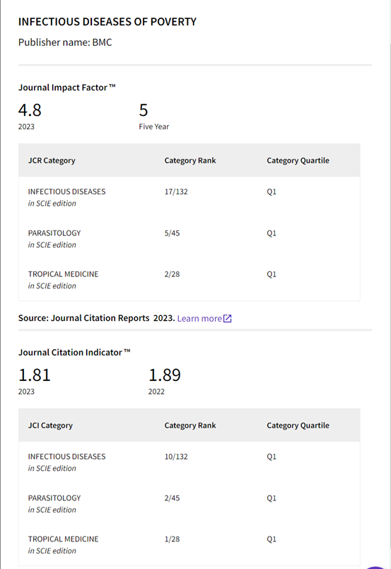 在科睿唯安发布的2024年度《期刊引证报告》中,Infectious Diseases of Poverty 2023年的影响因子为4.8,在所属学科领域均位于Q1区,在热带医学领域排2/28位,在寄生虫学领域排第5/45位,在感染性疾病领域排第17/132位。