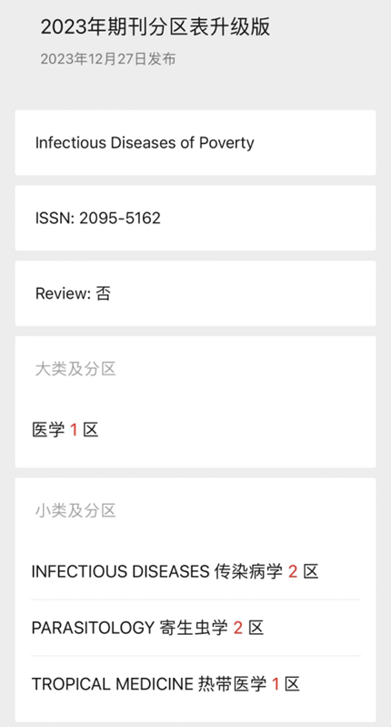 在中国科学院文献情报中心发布的期刊分区表中,Infectious Diseases of Poverty在医学大类和热带医学学科均位于1区。