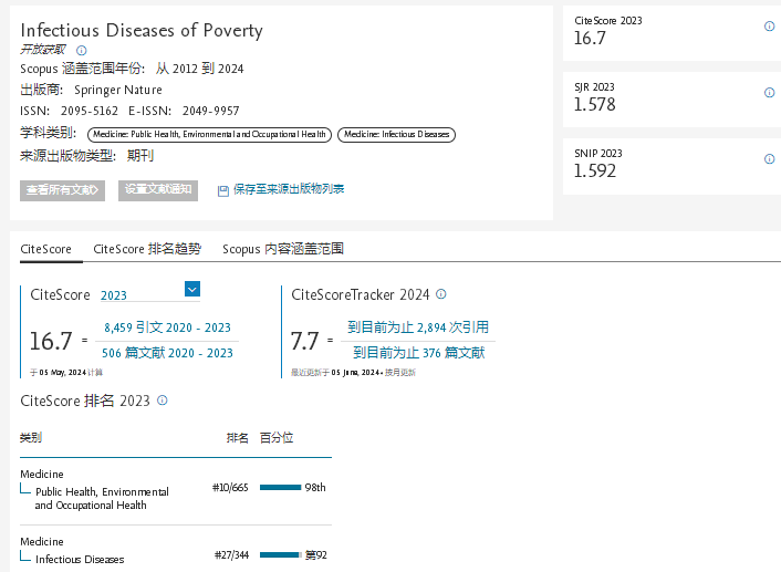 根据爱思唯尔发布的CiteScore,Infectious Diseases of Poverty 2023年的CiteScore是16.7,在公共卫生、环境和职业卫生领域的排名为#10/665,在感染性疾病领域的排名是#27/344。