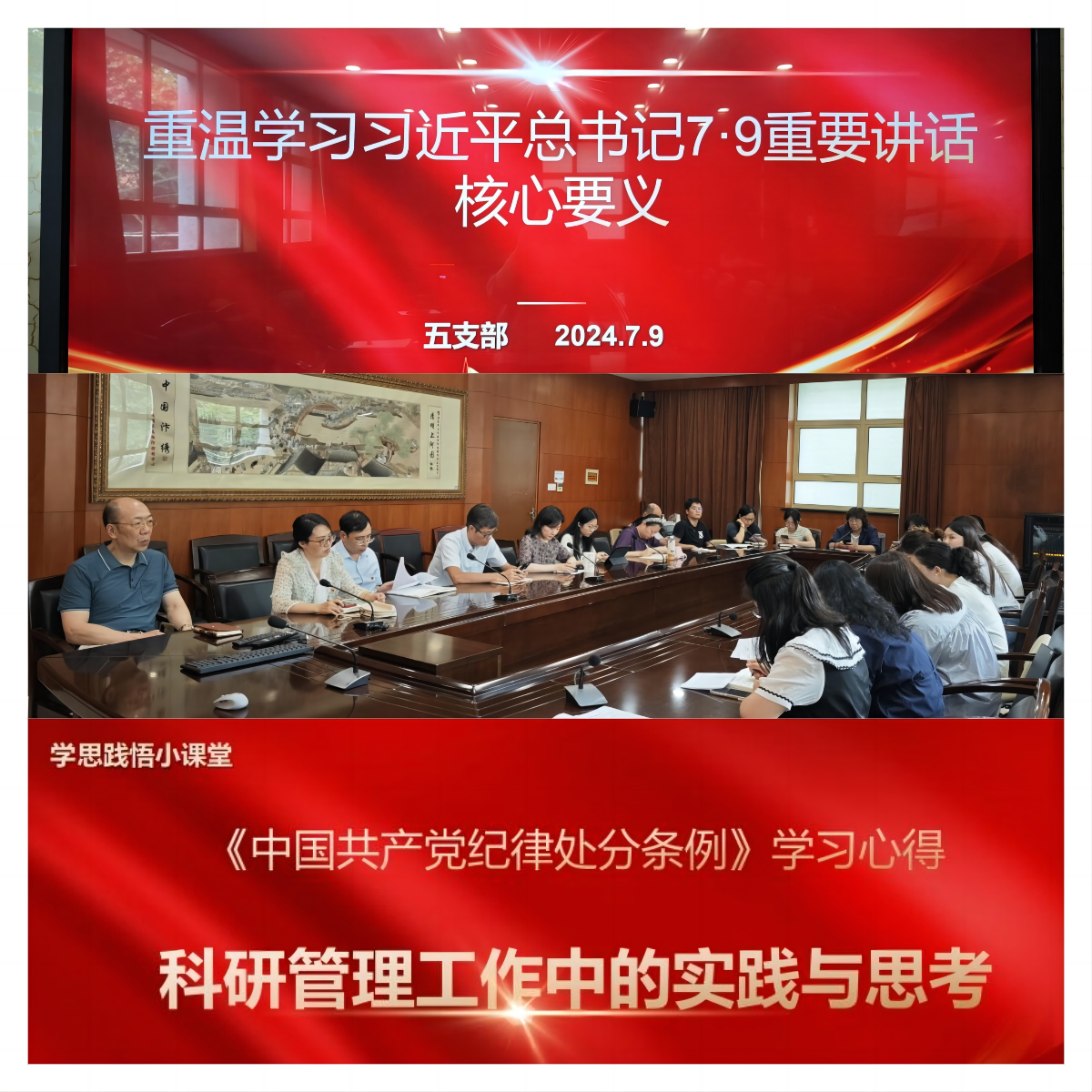 随后,支部纪检委员李真将新版《中国共产党纪律处分条例》中六大纪律的学习与自身科研管理工作经验相结合为大家开设专题讲座,交流分享了科研管理领域的党员如何明确自己的责任和使命,增强党的领导意识;如何提高科研工作的规范性和科学性确保党的路线方针政策在科研工作中得到全面贯彻;如何更好地约束自己的行为,维护科研环境的纯洁性和学术生态的健康发展,防止科研领域的腐败现象等方面的心得体会,并结合总书记“7·9”重要讲话中提出的“五个体系”建设探讨了在科研管理工作中落实《中国共产党纪律处分条例》的具体做法。作为职能部门管理岗位的党员,我们要始终坚定理想信念,严守党的纪律,积极探索建立健全科研管理服务体系,优化科研环境,提升科研管理效能,确保科研管理工作高质量发展,推动科研管理工作不断取得新的成绩。