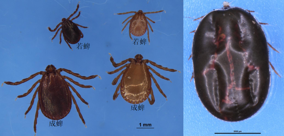 蜱又称“壁虱”、“狗豆子”、“草爬子”,属寄螨目蜱总科的暂时性寄生虫,全世界约有800种,我国记录的硬蜱科有100余种,软蜱科有10余种。躯体背面有壳质化较强盾板的通称为硬蜱,属硬蜱科;无盾板的通称为软蜱,属软蜱科。蜱呈圆形或卵圆形,由颚体和躯体组成;体长一般在2~10 mm之间,雌蜱饱血后可胀大至20~30 mm。