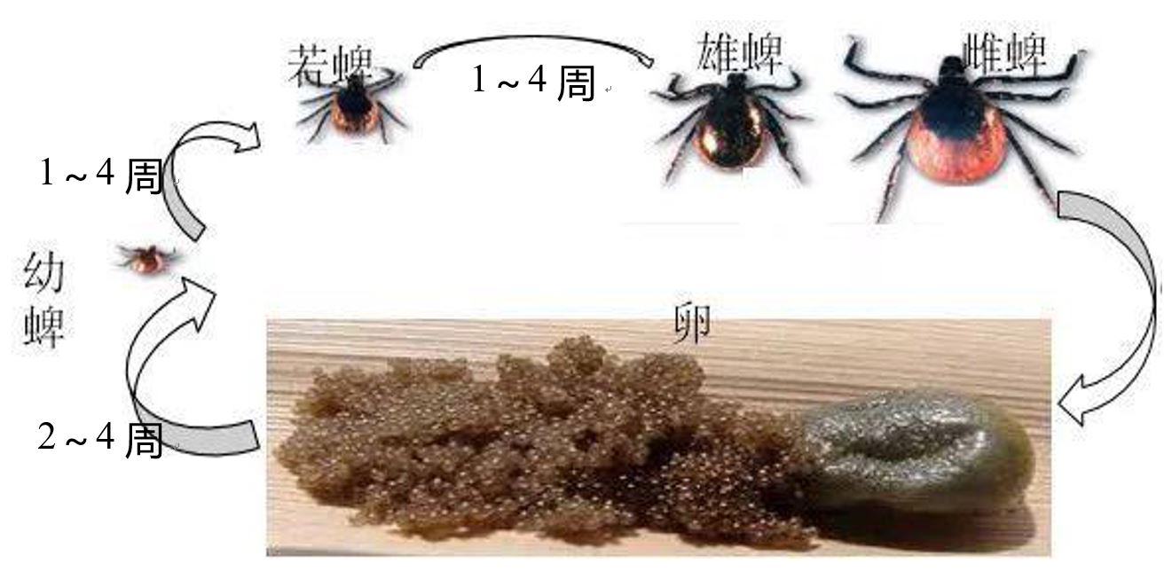 蜱的生活史包括卵、幼虫、若虫和成虫4个时期,幼虫有3对足,若虫、成虫有4对足。幼虫、若虫和成虫均可吸血,硬蜱多白天吸血,吸血后身体可胀大到原来的数倍至几十倍;软蜱多在夜间吸血。蜱寄生部位常在宿主皮肤较薄,不易被搔动的部位,比如人或动物的颈部、耳后(内)、腋窝、大腿内侧等处。