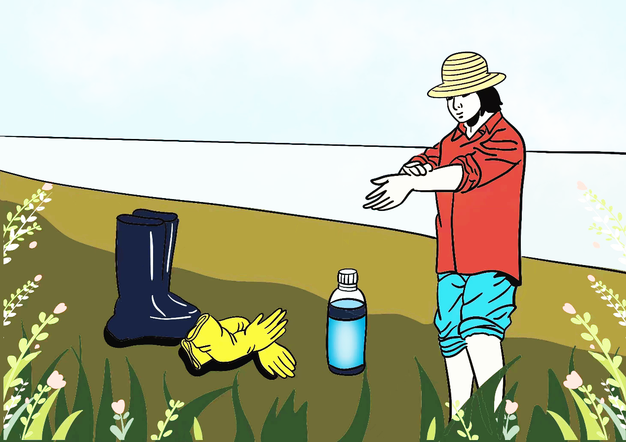 2.加强自身防护:因抗洪抢险、抢收抢种等原因无法避免接触水体时,须在下水作业前,将接触自然水体的皮肤部位均匀涂抹防蚴灵等防护药膏,并穿戴防护用品如胶靴、胶手套、胶裤等。