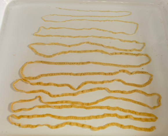 尽管张先生排出的虫体长度有十几厘米,但这只是它脱落的片段。盘踞在人肠道中的虫体,肆意吸收着宿主的营养,其长度可达10米,相当于3层楼那么高。