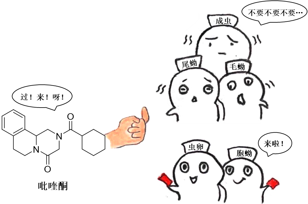 吡喹酮对多种血吸虫均有效,而且毒性较小,它的出现彻底改变了全球血吸虫病的治疗状况,给力不给力?吡喹酮不仅对血吸虫成虫有效,对毛蚴、尾蚴和刚刚钻入皮肤的童虫也有效,但对虫卵和胞蚴无效。除了血吸虫病,目前世界卫生组织还推荐使用它治疗其它吸虫病、丝虫病、肠道蠕虫感染和囊虫病等。