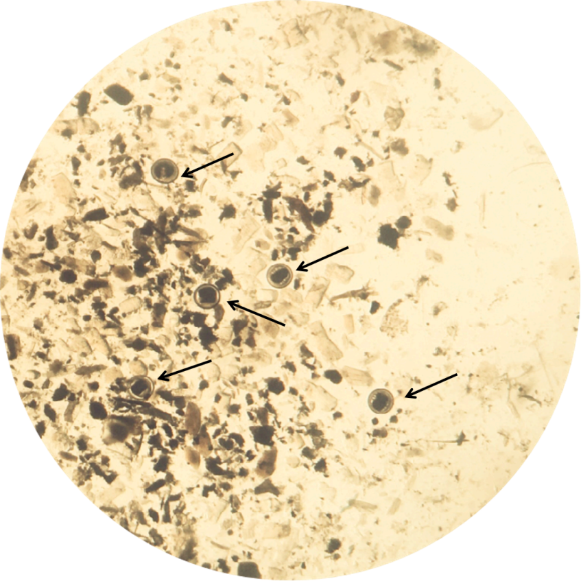 溪蟹中的肺吸虫囊蚴(箭头示)