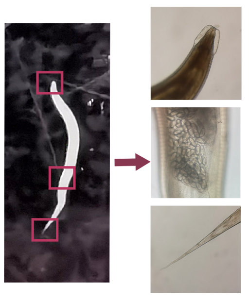 雌虫大小为(8~13)mm×(0.3~0.5)mm,雄虫大小为(2~5)mm×(0.1~0.2)mm。