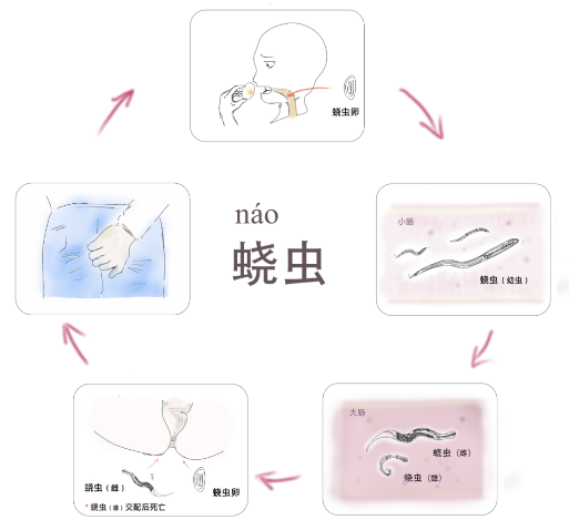 少数蛲虫卵会在肛门附近孵化,经肛门进入肠内,发育为成虫,造成逆行感染。