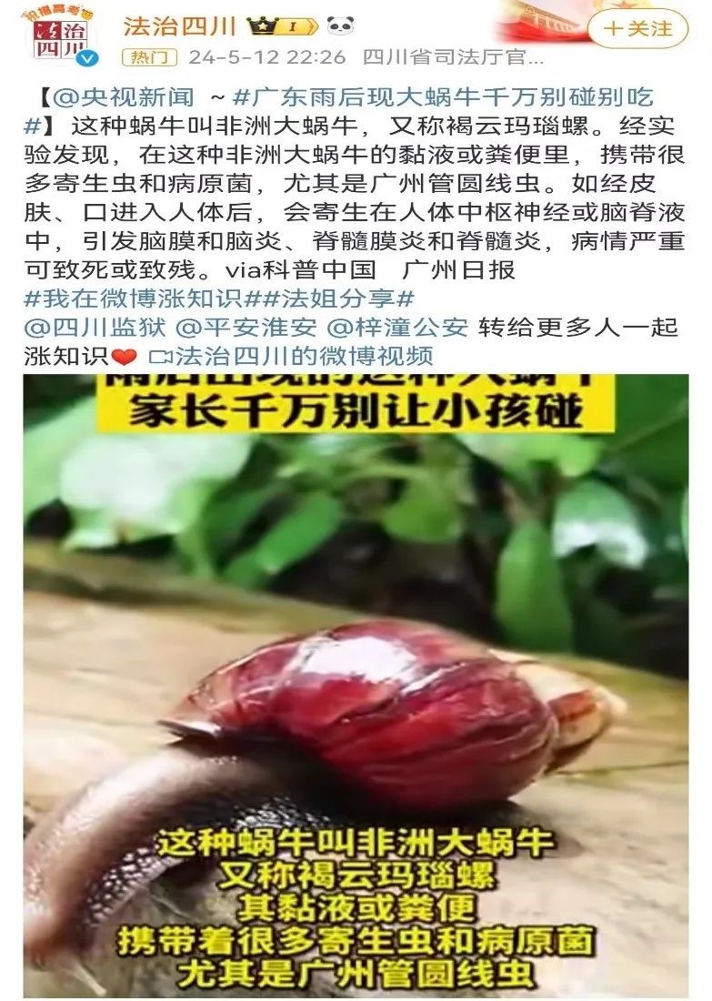 螺肉因味道鲜美营养价值高而受到很多食客的喜爱,但在享用美味的同时,需警惕误食福寿螺肉。福寿螺是广州管圆线虫的中间宿主,人们一旦食用了未经煮熟的或生的含有广州管圆线虫Ⅲ期幼虫的螺类或水,有可能患上广州管圆线虫病,不仅影响人们的健康,甚至可能危及生命。