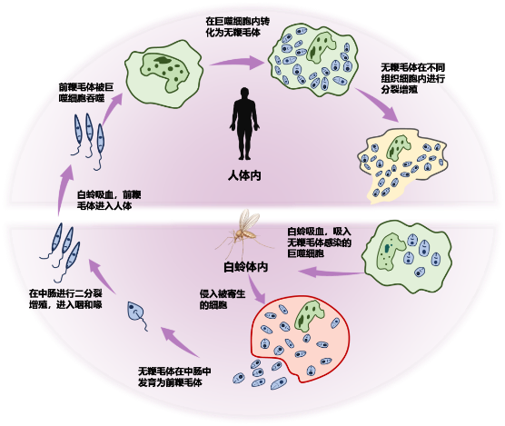 传播过程:白蛉通过叮刺病人或受感染的动物宿主时,含无鞭毛体的巨噬细胞被白蛉吸入并在体内发育成具有感染力的前鞭毛体,转而叮刺健康人,前鞭毛体即随白蛉唾液进入人体,从而引起感染。