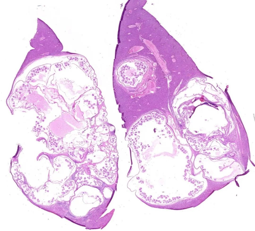 图3 泡型棘球蚴病的病理切片显微图像(取自于普通田鼠体内病灶),可见脏器内大量的棘球绦虫幼虫(原头节)