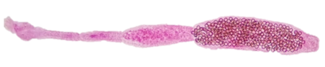 图4 显微镜下的棘球绦虫成虫(最下方的孕节片里为受精后的含胚卵)