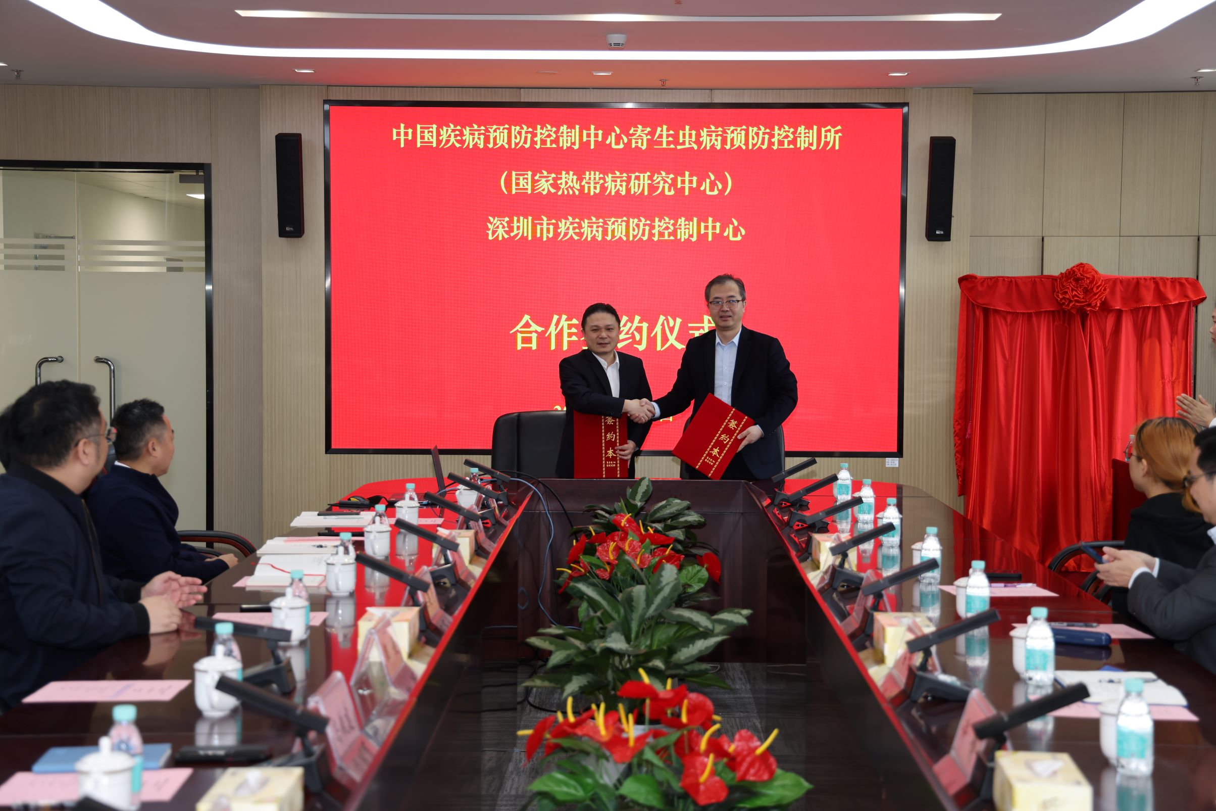 2025年2月19日,为了进一步推动中国疾控中心寄生虫病所(国家热带病研究中心)与深圳市疾控中心在输入热带病防控研究领域深度合作,双方在深圳签署热带病防治与科学研究合作框架协议,并揭牌成立“输入性热带病防控联合实验室”。此举标志着双方在热带病防控领域的合作迈入新阶段,将为粤港澳大湾区的热带病防控事业注入强劲动力。中国疾控中心寄生虫病所李石柱所长与深圳疾控中心邹旋主任分别代表双方签署协议并揭牌。深圳疾控中心副主任逯建华、首席专家冯铁建等二十余位专家共同见证。