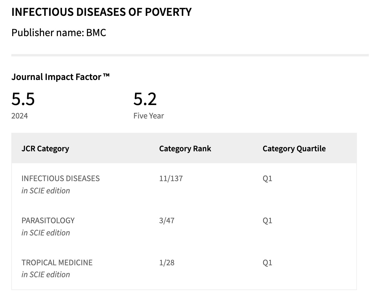 根据科睿唯安发布的2025年《期刊引证报告》,Infectious Diseases of Poverty的最新影响因子是5.5,在热带医学、寄生虫学和感染性疾病领域均位于Q1区,其中在热带医学领域排名第1位。