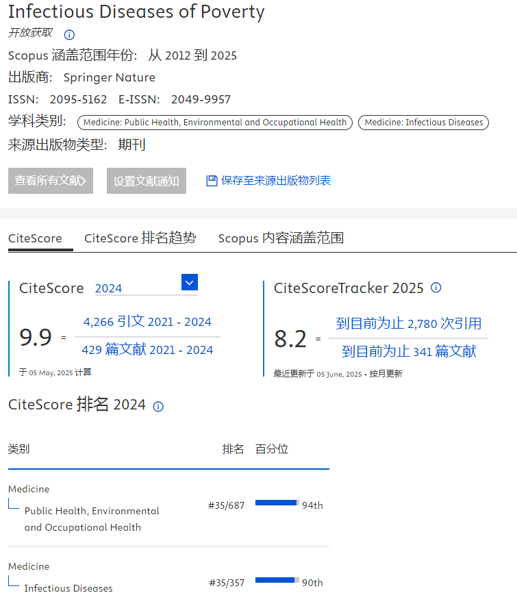 近日,根据爱思唯尔发布的CiteScore,Infectious Diseases of Poverty 2024年的CiteScore是9.9,在公共卫生、环境和职业卫生领域的排名是#35/678,在感染性疾病领域的排名是#35/357。