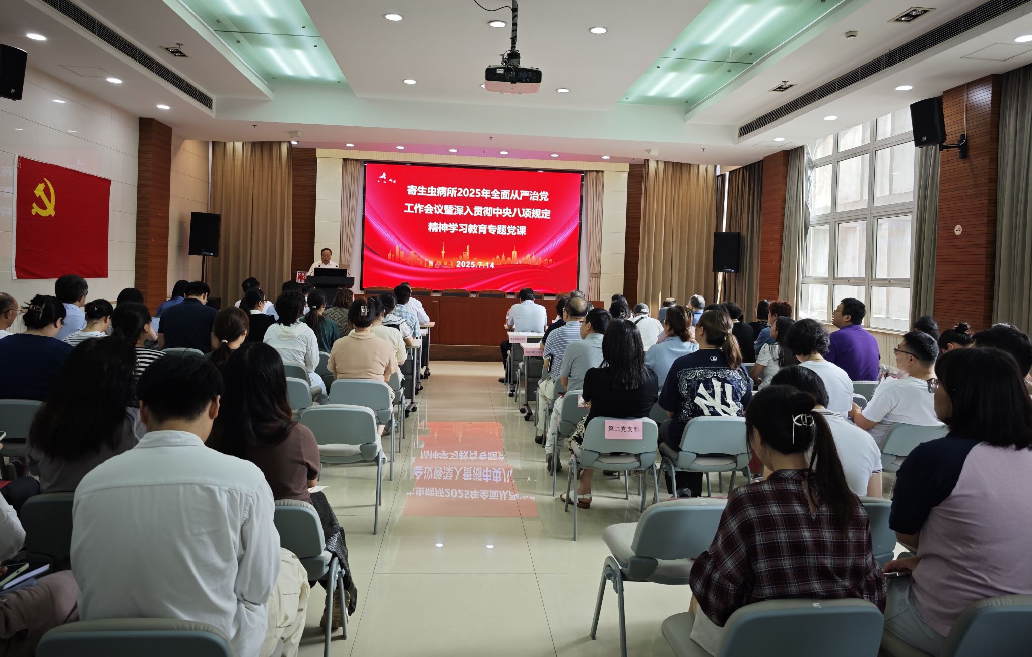 为庆祝中国共产党成立104周年,弘扬伟大建党精神,持续深化作风建设,寄生虫病所党委于2025年7月14日上午召开2025年全面从严治党工作会议暨深入贯彻中央八项规定精神学习教育专题党课。上海市卫生健康委直属机关纪委副书记夏欣同志莅临指导,所党委委员,在职党员,离退休党员代表,民主党派代表及入党积极分子约120人参加了会议。